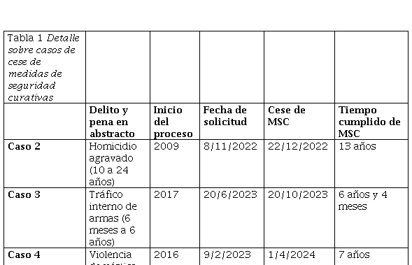 En la Tabla 1 se exponen los datos más relevantes de las causas en las que se litigó y logró el cese de medidas de seguridad curativas, detallando el tipo de delito, la fecha de inicio del proceso penal, la fecha de solicitud de cese de la medida de seguridad curativa, y el tiempo efectivamente cumplido de la medida impuesta.