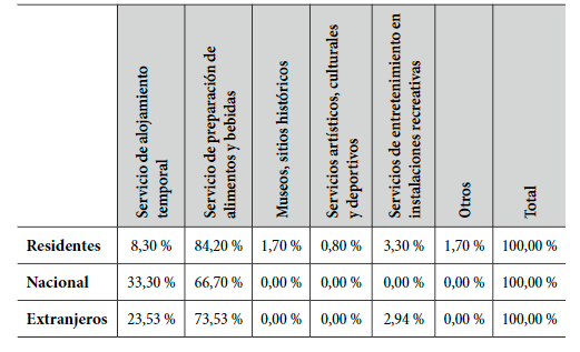 El primer indicador sobre el turismo sostenible analizado es el económico, en el cual, mediante un análisis de tablas de contingencias, se identificaron los servicios con mayor demanda por parte de los usuarios de los servicios turísticos analizados. Predomina la preparación de alimentos y bebidas en los tres casos y se destaca que los mismos residentes son aquellos que frecuentan mayormente estos establecimientos. Por otro lado, los turistas nacionales son aquellos que demandan mayormente los servicios de alojamiento temporal (ver tabla 6).