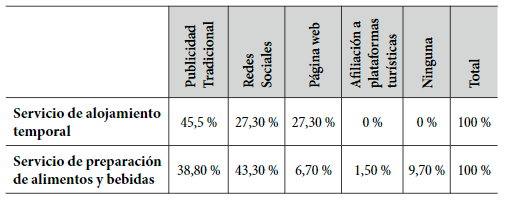 Realizando un análisis del cruce de dos o más variables, se logró describir el comportamiento de los datos referentes al tipo de actividad empresarial de las mipymes y el tipo de publicidad que utilizan, y se observó que el 45,5 % de los servicios de alojamiento temporal prefieren utilizar la publicidad tradicional para darse a conocer; por el contrario, los servicios de preparación de alimentos y bebidas se inclinan más por las redes sociales con un 43,30 % (ver tabla 7), las cuales resultaron ser su principal aliado económico para atraer turistas hasta en un 78,3 %, gracias al gran alcance que tienen y por la posibilidad de llegar a turistas más lejanos.