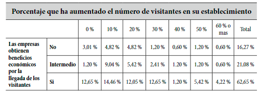 Cabe destacar que el 62,7 % de los empresarios consideran que sí se obtienen beneficios económicos por los visitantes de algún evento, festival o simplemente por el lugar. Al analizar la relación que existe entre el aumento de visitantes al establecimiento y los beneficios obtenidos consecuentemente, se encontró que el 39,3 % de las empresas obtienen beneficios gracias a la llegada de los turistas y que el aumento en sus visitantes ha sido entre el 10 % y el 30 % (ver tabla 9). Así mismo, se identificó que los mayores beneficiados en Tijuana por la llegada de los turistas son los establecimientos de servicios de preparación de alimentos y bebidas (48,5 %,); en cambio, en Mexicali es el sector del alojamiento temporal (67,9 %).