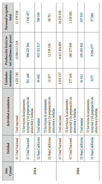 Para efectos de esta investigación, se llevó a cabo un análisis comparativo del turismo entre el 2004 al 2014, con la finalidad de conocer el comportamiento de la actividad estudiada respecto al nivel de gestión sostenible de las mipymes. Para esto, se consultó el Sistema Automatizado de Información Censal (saic, 2014) del inegi y se observó que a nivel nacional existen 501 448 unidades económicas pertenecientes a esta actividad, de las cuales el 2,05 % se encuentran en el Estado de Baja California, con una variación del 91,50 % respecto del año 2004 al 2014. Además, esta actividad económica aportó el 2,62 % al pib a nivel nacional en el 2014, observando un incremento de 0,12 % con respecto al año 2004, y, a nivel estatal, esta aporta el 10,74 % del pib de Baja California. De igual manera, en los años antes mencionados, se observa que en esta actividad económica sufrió una variación del 56,18 % en el personal ocupado en la entidad (ver tabla 1).
