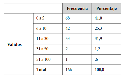 Con relación al tamaño de las empresas participantes, predominaron las micro hasta en un 41 %, seguida de las pequeñas con un 25 %; cuya media de contratación es de 2 empleados al año; la media de antigüedad de las empresas es de 16 años, mostrando rangos de inicio de operaciones desde 1 hasta 88. De igual forma, se estableció que el 2015 fuel el año en el que más establecimientos de esta índole fueron constituidos (13,9 %) (ver tabla 3).
