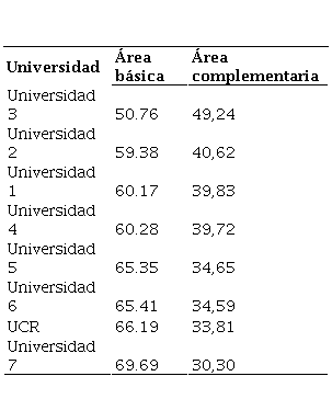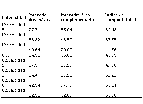 Se puede ver que en lo que se refiere al indicador área básica, la Universidad 5 tiene una distribución del plan de estudio más acorde con lo que demandan las empresas censadas, mientras que la Universidad 2 es la que más se aleja de lo que solicitan las compañías. Así mismo, se observa que la UCR se encuentra en cuarto lugar a menos de un punto de la Universidad 3 que está en tercero, según el indicador área básica. Con respecto al indicador área complementaria, la Universidad 1 es la que mejor se asemeja en distribución porcentual a lo requerido por las empresas, además de que la Universidad 6 está en último lugar del índice con 77.75 puntos. La UCR se encuentra en el sexto lugar para ese indicador.