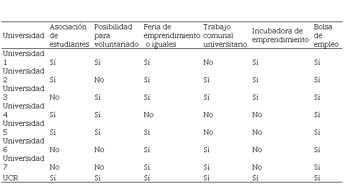 Ahora bien, un 62.5 % de las universidades tomadas en consideración poseen una plataforma para realizar voluntariado; en ese porcentaje se encuentran todas las universidades estatales, incluyendo la UCR, y solo la Universidad 3 que se encuentra en el grupo de universidades privadas, la tiene. Además, un 87.5 % de las universidades hacen una feria de emprendimiento o proyectos semejante en los cuales los estudiantes desarrollan una idea de negocio y es notorio que la totalidad de las universidades tienen una bolsa de empleo para sus estudiantes.