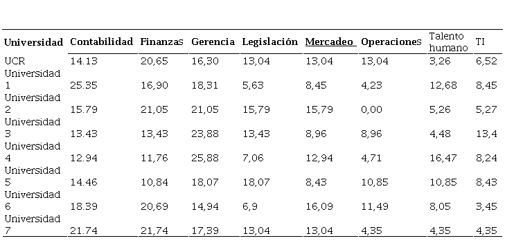 Cabe destacar que, en todas las universidades, la parte a la que más dedican sus cursos es a la gerencia, con porcentajes que van desde el 14 % a casi el 36 %, como se puede observar en la tabla 5 (anexo 1) seguido de contabilidad y finanzas. Un detalle notable por destacar es que la UCR le dedica casi un 21 % a gerencia, que es el área a la cual más dedica importancia porcentualmente en el plan de estudio.