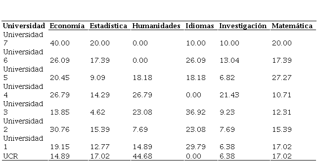En cuanto al análisis del área complementaria es importante notar en la figura 3 que la UCR dedica más a humanidades, mientras que en contraparte la Universidad 7 y la Universidad 6 no le dedican nada a esta disciplina. Se permite apreciar que la UCR en su plan de estudio no posee créditos asignados al idioma, al igual que la Universidad 4. En contraparte, se puede notar que la Universidad 1, la Universidad 6 y la Universidad 3 le dedican más de un 25 % de la distribución a idiomas. Por último, en las áreas complementarias se puede ver la importancia que le ponen las universidades a la disciplina de economía, destacando la Universidad 7 y la Universidad 2 con más de un 30 % cada una.