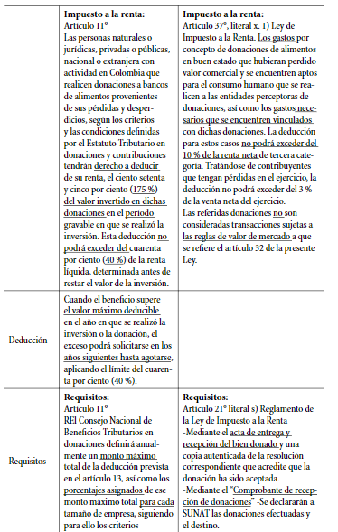 Sin embargo, los porcentajes de beneficios tributarios marcan la diferencia entre ambos documentos, ya que en la propuesta colombiana podría aprovecharse hasta el 175 % del valor de las donaciones dirigidas a los bancos de alimentos, y hasta el 40 % de las rentas líquidas; sin embargo, en la Ley 30948 solo es permitido en el mejor de los escenarios la deducción del 10 % de las rentas netas del ejercicio de la empresa, colocándole un límite al apoyo que se brindará y no promoviendo el mayor apoyo como lo hace la propuesta colombiana.