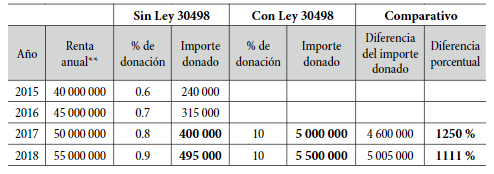 Con ello, se realizó un comparativo diferencial usando los porcentajes máximos permitidos en Perú. De esta forma, se observó el posible incremento en las donaciones de alimentos y se notó el considerable resultado después de aplicar los porcentajes para ambos escenarios; en ese sentido, se tienen diferencias sustanciales del importe que sería donado, las cuales llevadas a un nivel porcentual, representarían en el nuevo escenario con la Ley 30498, por ejemplo para el año 2017, un incremento equivalente al 1250 % de lo que usualmente se tendería a donar.