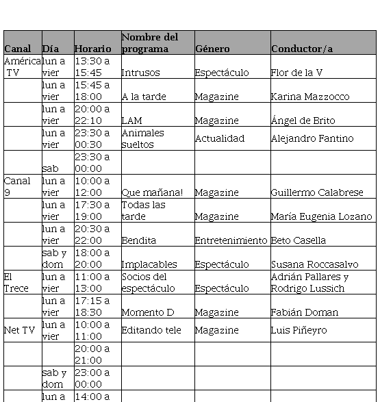 En la grilla televisiva los programas de panelismo están circunscriptos a un determinado género televisivo, siguiendo la manera en que han sido calificado, se observa que del total de las horas de panelismo que se transmiten, un 70% lo hace bajo el género magazine, un 20% programas de espectáculos, 5% entretenimiento, 3% deporte y 2% actualidad. Una primera cuestión a señalar está en relación a la manera en que los programas se autodefinen en las grillas y lo que transmiten, hacemos referencia a que muchos programas se posicionan como magazine, pero son de hecho programas de espectáculos. Esto no es un dato menor ya que la suma nos marca que el 90% del tiempo de emisión son programas que tematizan sobre la vida privada y pública de personas ligadas al mundo del espectáculo y la farándula.