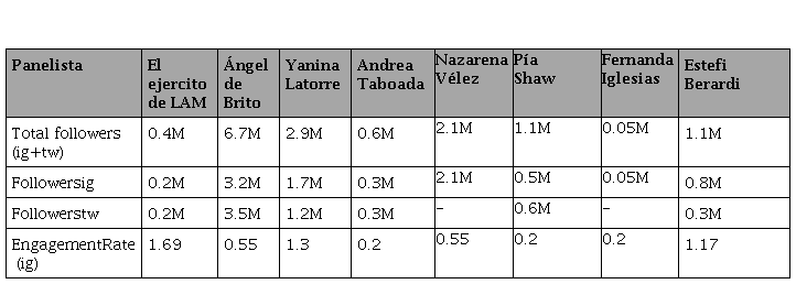 El actual sistema híbrido de medios o en términos de FERNÁNDEZ (2021) postbroadcasting, conlleva adentrarnos en las complejidades que se suscitan en la relación entre el broadcasting y las redes sociales digitales. En esa interacción que va y viene entre uno y el otro es que LAM se retroalimenta. Aggiornado a la época, en su actual temporada ha incluido una cuenta de Instragam #elejercitodelam, con un número de teléfono “línea de chimentos”, así interactúa con sus seguidores. Asimismo, el conductor y algunas panelistas tienen una alta presencia en Instagram y Twitter, generan contenido y/o continúan en sus redes debates que se emiten en el programa,retroalimentando así no sólo sus cuentas personales sino generando un contenido continuo que va y viene entre el sistema broadcasting y las redes sociales. Compartimos, a continuación, lasiguiente tabla con las métricas en Instagram y Twitter de Ángel de Brito, las panelistas y la cuenta oficial de LAM.