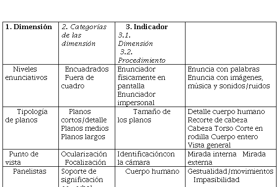 De manera que luego de visionar la unidad de análisis, conformada por las cinco emisiones televisivas, hemos elaborado una matriz de datos (YNOUB, 2013b) [Tabla 3] compuesta por dimensiones e indicadores. Las dimensiones seleccionadas constituyen aspectos particulares de la unidad de análisis, vinculadas con el nivel de estudio de los componentes cinematográficos (CASETTI y DI CHIO, 2014) observados en LAM, al tiempo que sus categorías son los estados posibles entre los cuales las dimensiones pueden oscilar. Dichas categorías mantienen criterios de exhaustividad –debido a que representan la totalidad de los estados posibles– y exclusividad –en tanto que cada categoría excluye a las restantes–, al tiempo que han sido ordenadas de acuerdo a un fundamento común.