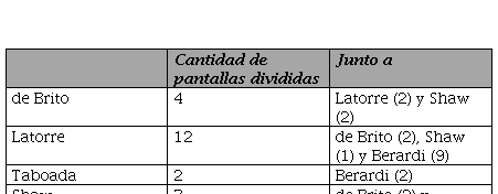 La tabla que se presenta a continuación cuantifica el uso de la pantalla dividida exclusivamente entre el conductor y las panelistas[26] [Tabla 4]. Se observa entonces que el mayor número de discusiones se produjo entre Latorre y Berardi, los cuales fueron reflejados y/o acentuados a través de este recurso de composición.