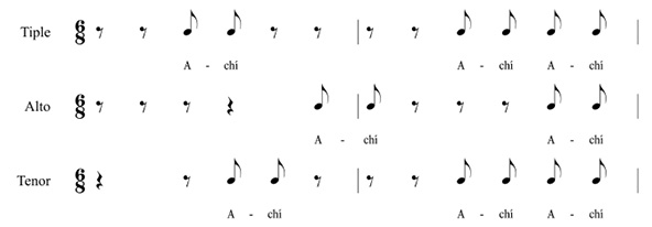 La música en el ámbito de la fiesta baja la tensión del conflicto social. Si bien había algún grado de familiaridad con la música que los esclavos africanos hacían en las calles de las ciudades, tanto la diversidad de las prácticas musicales de origen africano como las funciones que esa música cumplía –ceremoniales, sociales, de iniciación, etc.– quedaron en la penumbra. La experiencia muestra que ciertas texturas y combinaciones sonoras fueron codificadas como típicas de los negros,60 lo que quedó plasmado en los villancicos a través del uso del diálogo, la alternancia en las voces, las síncopas, hemiolas, suspensiones, contratiempos y diversas combinaciones de patrones rítmicos.