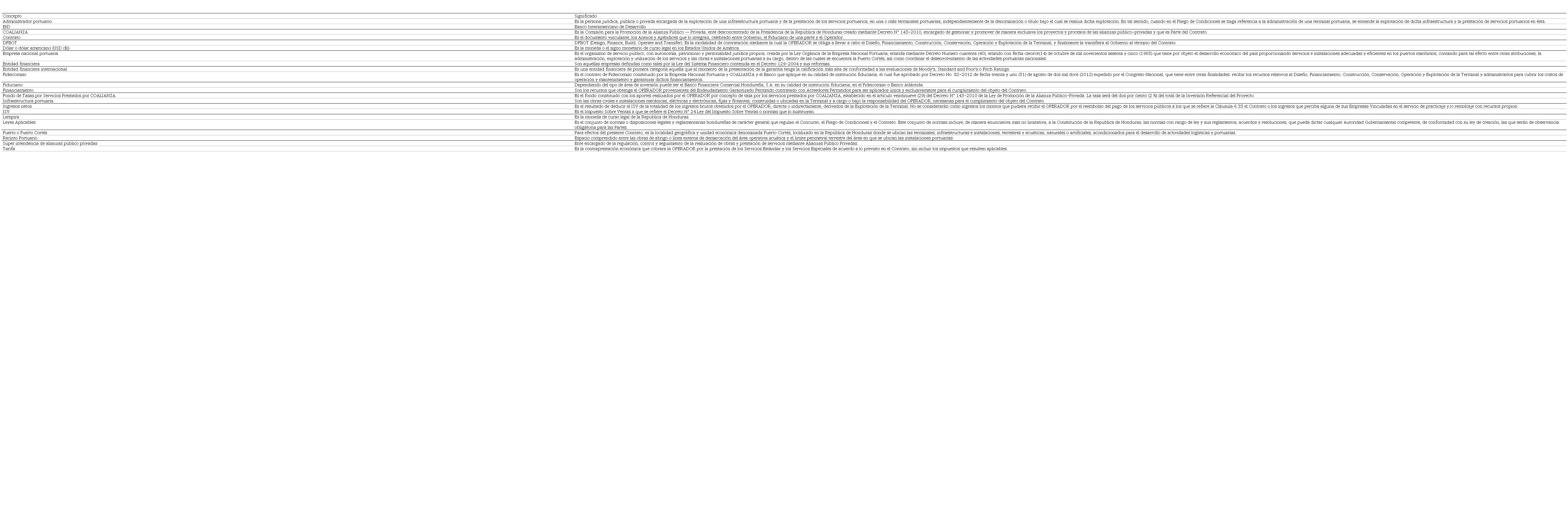 Los siguientes conceptos son extraídos del contrato para el Diseño, Financiamiento, Construcción, Conservación, Operación y Explotación de la Terminal de Contenedores y Carga general de Puerto Cortés, que suscriben la República de Honduras actuando a través de la Comisión para la Promoción de la Alianza Público-Privada (COALIANZA) y Banco Financiera Comercial Hondureña, S.A., por una parte, y operadora de Puerto Cortés, S.A. de C.V. por la otra.