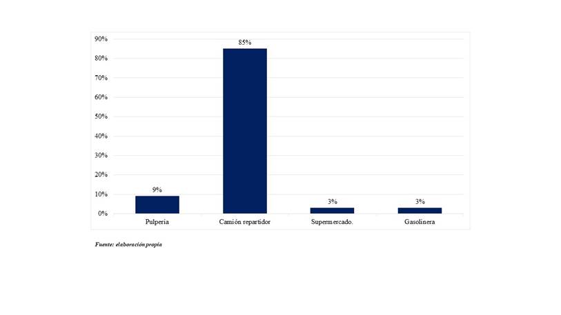 Al preguntar a la población del casco urbano de la ciudad de Tela acerca de dónde compran el agua purificada embotellada que consumen en sus hogares, el principal canal de distribución es el camión repartidor con el 85%, la población prefiere comprar el agua que consume de esta forma por comodidad ya que los camiones llevan el agua a sus hogares. De igual forma, utilizan otros canales de distribución como las pulperías utilizado por el 10% de la población encuestada. Otros consumidores compran agua purificada embotellada en los supermercados (3%) y un 2% de los consumidores compran en las gasolineras.