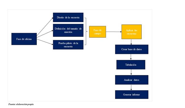 Una vez aplicada la encuesta se procedió a la generación de una base de datos para elaborar los gráficos y presentar los resultados encontrados. En la figura 1 se observa el resumen del proceso metodológico llevado a cabo en la investigación.