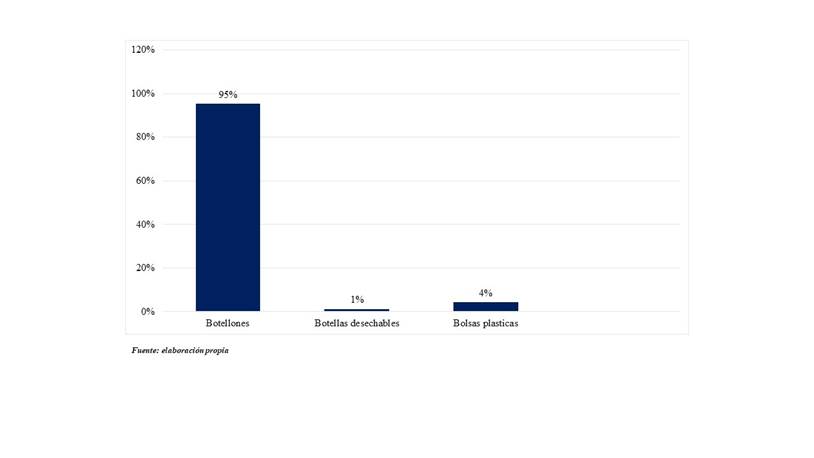 Los resultados muestran que el 99% de la población del casco urbano de la ciudad consumen agua purificada. De ese valor, el 95% de la población consume agua purificada embotellada en una presentación de cinco galones. Un 3% consume agua purificada en bolsas plásticas de medio litro y solamente un 1% la consume en botellas desechables de un litro o medio litro. Esto muestra los principales productos consumidos por la población del casco urbano.