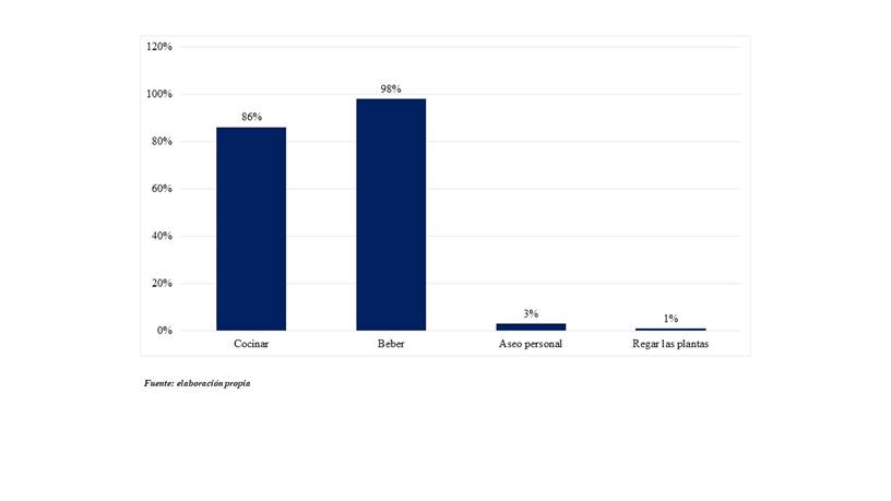 Los pobladores locales dan diversos usos al agua purificada embotellada entre estos destacan utilizarla para beber 98%, para preparar los alimentos (86%), un 3% la utiliza para aseo personal y un 1% para regar las plantas. Estos resultados tienen el mismo comportamiento de la figura anterior ya que en ambos casos se refleja que no se puede tomar el agua que llega a los hogares y la población prefiere no arriesgarse.