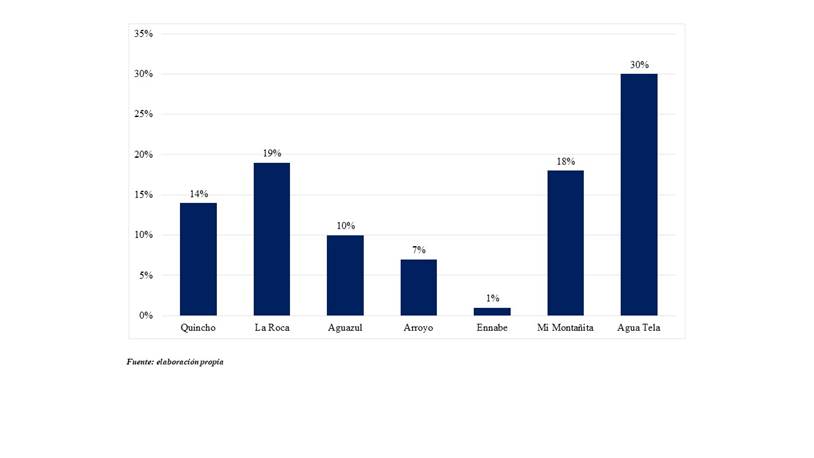 De las empresas mencionadas la que domina el mercado local es Agua Tela consumida por el 30% de la población, en segundo lugar, se encuentra Agua La Roca con el 19% y, en tercer lugar, Agua Mi Montañita con el 18%. La empresa que menos vende es Agua Ennabe con un 1%.