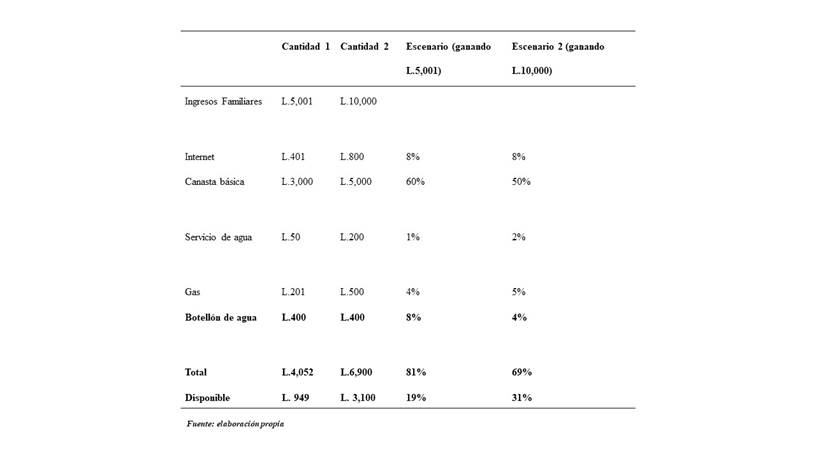 Para darse cuenta de cuál es el impacto real que tiene el consumo de agua embotellada en los pobladores del casco urbano de la ciudad de Tela, es necesario comparar los ingresos con el gasto a nivel familiar y con otro tipo de gastos que tienen la mayoría de la población. A continuación, un análisis comparativo de los ingresos con el gasto en agua embotellada y otros tipos de gastos recopilados con el instrumento de investigación.