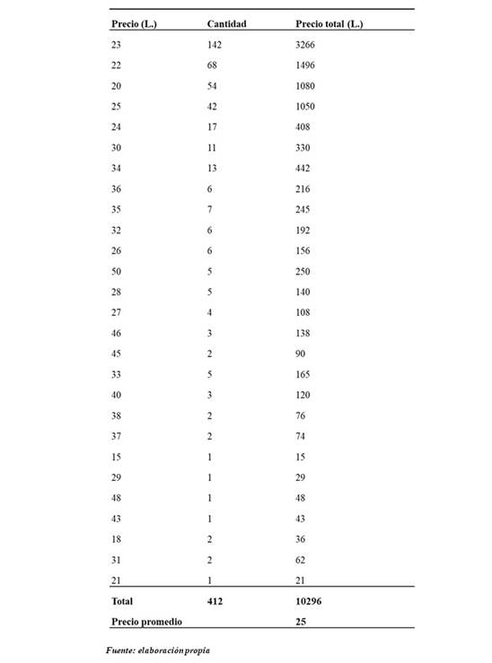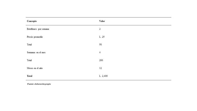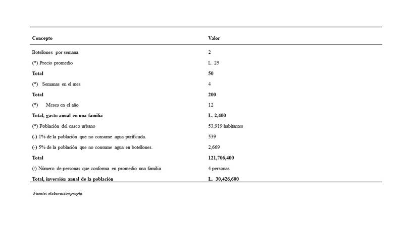 The economic analysis shows that eight bottles of purified water are consumed per month at an average price of 25 lempiras. Each year, the population of the urban area of the city of Tela spends 30,426,600 lempiras (US$1,261,468) on purified water consumption.