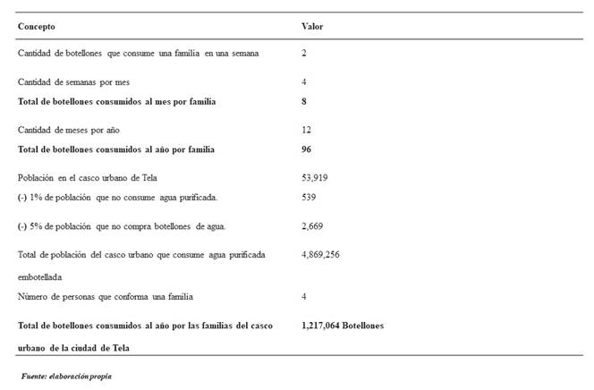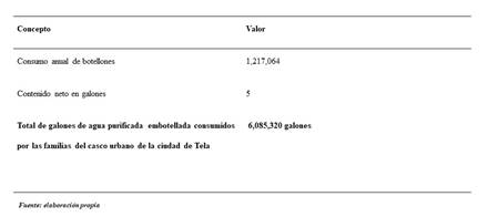 En la tabla 6 se realiza un cálculo de cuánto es el consumo anual total de botellones de agua purificada de la población del casco urbano de la ciudad de Tela.