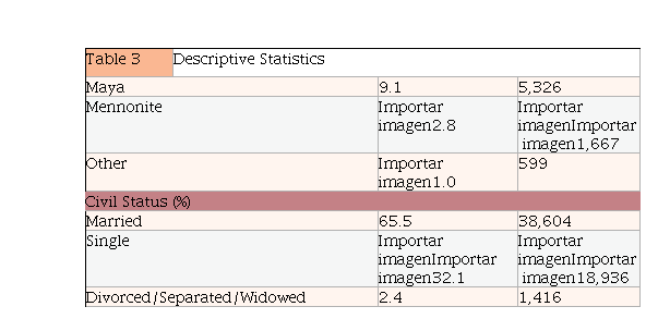 Two-thirds of the sample were married and on average worked fulltime (44.3 hours per week). Additionally, the ethnic composition mirrored the national profile with Hispanics (a summation category of mestizos and Spaniards) the numerically largest ethnic group followed by Creoles (encompassing Creoles, Africans and Blacks), and Maya (comprised of Ketchi, Mopan, and Yucatecan Maya).