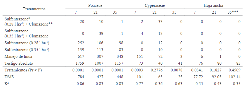 Densidad de malezas por tipo de planta. El análisis de varianza muestra diferencias significativas entre tratamientos (p = 0.0001) para las tres fechas de muestreo (7, 21, y 35 dda), en lo referente a densidad de malezas poaceas. Los tratamientos Sulfentrazone 0.28 l ha-1 + Clomazone, y Sulfentrazone 0.35 l ha-1 + Clomazone, resultaron tener mejor efectividad en el control de poaceae desde los 7 dda con 98.98 y 100% por ciento de control, el cual se mantuvo hasta los 35 dda, ambos con 99.9%. En segundo orden, los tratamientos Sulfentrazone 0.28 l ha-1, y Sulfentrazone 0.35 l ha-1, mostraron un efecto similar en el control de poaceas desde los 7 dda con 85.7 y 92.1% de control, manteniéndose hasta los 35 dda con 91.5% y 92.8%. Los cuatro tratamientos antes mencionados superaron al manejo del agricultor, que inicio con controles de 64.9% y finalizo con 69.9%, y el testigo absoluto, que no proporcionó control alguno (0 %), y se mantuvo enmalezado durante todo el periodo crítico del cultivo (cuadro 1).