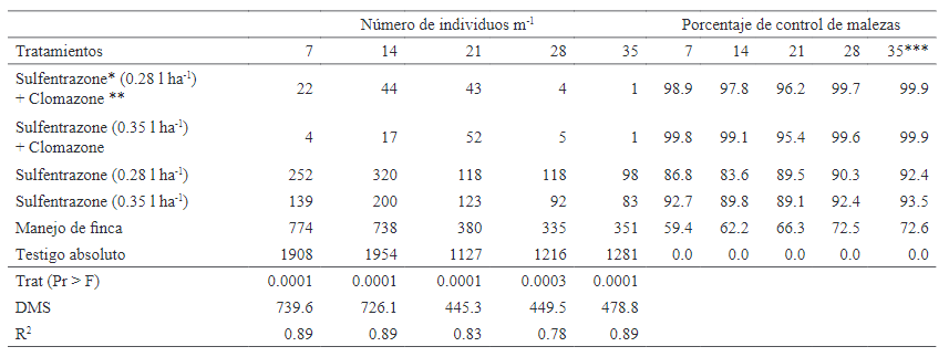 En términos porcentuales de control, los tratamientos Sulfentrazone 0.28 l ha-1 + Clomazone y Sulfentrazone 0.35 l ha-1 + Clomazone, resultaron con la menor densidad de malezas, y con la mejor efectividad para el control de las malezas, con valores próximos al 100 por ciento de reducción de la población de malezas (cuadro 2). Un segundo bloque lo conforman los tratamientos Sulfentrazone 0.35 l ha-1, Sulfentrazone 0.28 l ha-1, que mostraron rangos entre 80 y 90 por ciento de control (cuadro 2), contrario al tratamiento manejo del agricultor que obtuvo porcentajes de control entre 60 y 70 por ciento a lo largo de las evaluaciones. El tratamiento testigo absoluto fue utilizado como referencia para determinar el porcentaje de control de los tratamientos con intervención, por tanto, no reflejo control alguno debido a que las parcelas experimentales se manejaron enmalezadas durante toda la etapa crítica del cultivo.