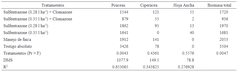 Según el análisis de varianza, existen diferencias significativas para el tipo de maleza poaceas (p = 0.0043). La mayor biomasa se obtuvo en el testigo absoluto, el cual muestra el comportamiento esperado en campo sin ningún tipo de control de malezas, por tanto, fue utilizado para calcular la reducción de biomasa de poaceas en aquellos tratamientos que si recibieron medidas de control de malezas. La menor biomasa de poaceas fue obtenida en el tratamiento Sulfentrazone 0.35 l ha-1 + Clomazone, lo que representa 74.3% de eficiencia en reducción de biomasa con respecto al testigo absoluto. Los tratamientos Sulfentrazone 0.28 l ha-1 + Clomazone, presentó 54.93%, Sulfentrazone 0.35 l ha-1, 52.10%; Sulfentrazone 0.28 l ha-1, 45.65% y manejo de finca 44.19% de reducción de biomasa de poaceas con respecto al testigo absoluto (cuadro 3).