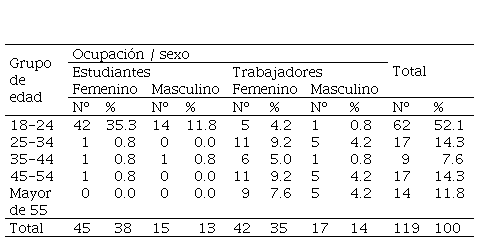 La población que conformó el estudio fue en total 119 personas de los cuales el 50.4 % son estudiantes y 49.6 % trabajadores, solo una persona (estudiante) seleccionada como unidad de análisis rechazó participar en la encuesta. Con relación al sexo el 73.1 % de los participantes es femenino y 26.9 % masculino. En los grupos de edades, más de la mitad del total de participantes pertenecen al grupo de edad de 15 a 24 años. Los siguientes grupos de edad más encontrados fueron de 25 a 34 años y 45 a 54 años. Predomina el grupo de 18 a 24 años en los estudiantes y los mayores de 25 años en los trabajadores. La mediana de la edad es 24 años con una media de 32.2, una desviación estándar de 14.08, una edad mínima de 18 años y un máximo de 68 años (Cuadro 2).