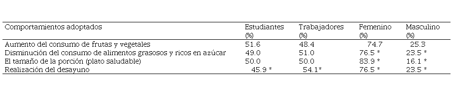 El estudio encontró diferencia significativa entre estudiantes y trabajadores en el comportamiento de realización del desayuno. Así mismo, hubo diferencias significativas en hombres y mujeres en los comportamientos de disminución de grasas y alimentos ricos en azúcar, en la realización del desayuno y en el tamaño de la porción.