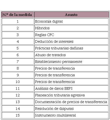 En septiembre de 2013, a raíz de la publicación del informe titulado Lucha contra la erosión de la base imponible y el traslado de beneficios en febrero de 2013, los países de la OCDE y del G-20 avalaron y adoptaron un Plan de Acción conformado por 15 líneas de actuación o «acciones» para dar respuesta a los problemas BEPS. Dicho Plan de acción y las 15 medidas que lo conforman giran en torno a tres pilares fundamentales: dotar de coherencia a las normas de Derecho interno que afectan a las actividades transfronterizas; reforzar el criterio de actividad sustancial contemplado por las normas internacionales en vigor y, por último, mejorar la transparencia y la seguridad jurídica. (OCDE, 2016, p. 3)