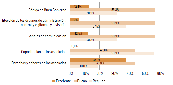 Finalmente, las pymes, en pro del cumplimiento de las diferentes etapas relacionadas con los derechos y trato equitativo de los asociados, se acogen a las diversas proposiciones del gobierno corporativo, razón por la cual es relevante conocer si cuentan con un código de buen gobierno previamente establecido, debidamente organizado, regulado y de aplicabilidad en el tiempo que sea necesario; como resultado, se observó que el 56.25 % tiene un código establecido y el 12.5 % presenta un resultado excelente.