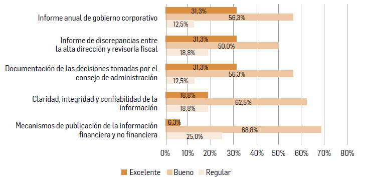 Fuente: elaboración propia.Es importante acotar que las empresas deben implementar mecanismos que faciliten la comunicación de la información para los usuarios que la requieran, sea de tipo económico y financiero, o de control interno y administrativo que se utiliza para que la organización alcance sus objetivos. La encuesta reflejó que el 56.3 % tiene en cuenta mecanismos de difusión para los asociados, miembros del consejo de administración y otros interesados acerca de la información financiera y no financiera.