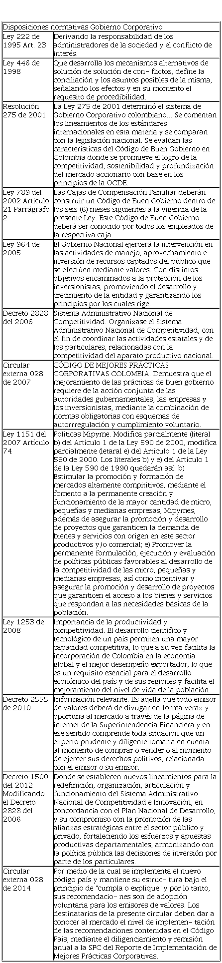La Tabla 1 relaciona las principales disposiciones normativas en relación al gobierno corporativo en Colombia: