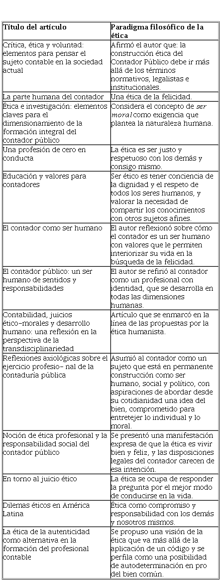 Ahora bien, al revisar las publicaciones en el contexto de la ética, la contabilidad y, por su puesto, el oficio del contador, se encontraron narrativas que fueron más allá de los principios y códigos normativos que rigen la profesión. Así es como, desde cada autor, se plasmó una convicción de que la ética no era solamente atender mandatos legales, pues temas como felicidad, naturaleza humana, justicia, dignidad, valores, identidad, vida interior, humanismo, idea del bien, mejor manera de conducir la vida, ética como compromiso y responsabilidad con nosotros mismos y con los demás, bien común; plantearon, entre otros, argumentos que se alejaron de un contexto meramente de principios normativos, pues tocaron con el sujeto moral, entendido como la persona que posee una voz interior que persuade al momento de tomar decisiones, sobre todo de aquellas que no van con el bien común.