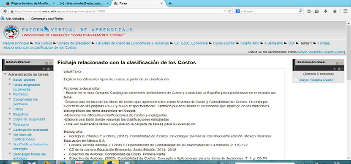 Sumado a lo anterior, en la Figura 1 se muestra un ejemplo de actividad de la asignatura Costo que fue empleada en el aprendizaje en línea desde Moodle y el correo electrónico con los estudiantes de Educación Economía del cuarto año. Se propuso como estudio independiente y tuvo como objetivo explicar los diferentes tipos de costos a partir de su clasificación.