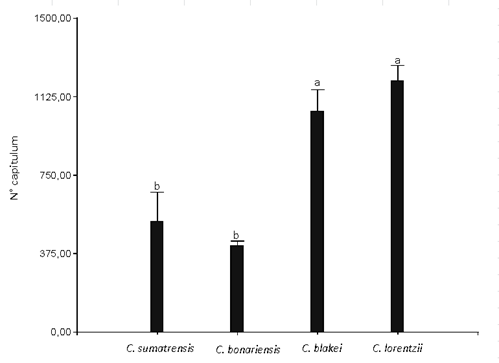 The number of capitulums per plant presented significant differences in the different species of Conyza analyzed. The highest production of capitulums was observed in C. lorentzii and C. blakei, with an average number of 1,202 and 1,056 capitulums per plant, respectively. C. sumatrensis and C. bonariensis showed significant differences (α = 0.05) with the previous group with 529 and 415 chapters, respectively (Figure 4).