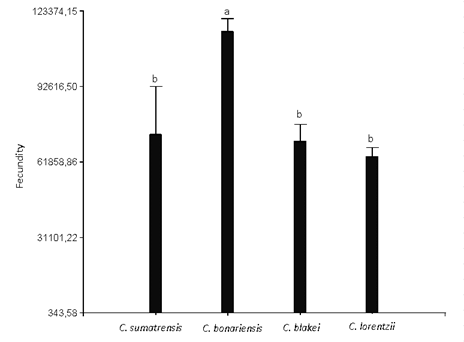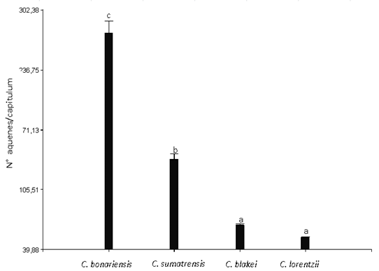 The number of achenes per capitulum showed significant differences in the different evaluated species (Figure 5). The behavior of this variable was inverse to that observed in the production of capitulums/plant, being C. bonariensis (276.72 achenes/capitulums) the species that produced the highest number of achenes, second C. sumatrensis (138.3 achenes/capitulum), and finally, C. blakei (66.4 achenes/capitulum) and C. lorentzii (53.04 achenes/capitulum), not showing a significant difference between them.