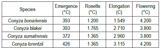 In addition, the accumulated thermal time was calculated for the 4 species of Conyza at the end of each phenological stage (Table 1). Such data will be very useful to consider the duration of each stage in different geographical areas.
