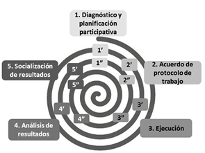 Una vez confrontadas las principales problemáticas con las capacidades institucionales, se estableció un modelo organizativo del trabajo. Este modelo organizativo se basó en la conformación de subgrupos temáticos y operativos integrados siempre por productores/as, investigadores/as y extensionistas. Así se constituyeron tres grupos operativos: uno dedicado al abordaje de la degradación de suelos, otro para afrontar el manejo de insectos y un tercer grupo dedicado a problemáticas vinculadas a enfermedades de los cultivos. Cada subgrupo de trabajo organizó las actividades en torno a problemáticas planteadas por el productor, transformándolas en preguntas de investigación, con la utilización de dispositivos en red basados en el trabajo colaborativo. Se establecieron ciclos anuales de trabajo a lo largo de los cuales se realizaron experimentaciones con los productores en sus fincas, utilizando la metodología de iap. Estos ciclos incluyeron las siguientes etapas: 1- Diagnóstico y planificación participativa; 2- Acuerdo de protocolo de trabajo; 3- Ejecución; 4- Análisis de los resultados; 5- Socialización de los resultados. Una vez que llegaba a su fin, con la socialización de los conocimientos generados y la formulación de nuevas interrogantes, el ciclo volvía a iniciar (1’, 2’, 3’, 4’, 5’; 1», 2», 3», 4», etc.); de este modo, se brindó continuidad al proceso de coconstrucción (Figura 1). A continuación, se describen las etapas del proceso.