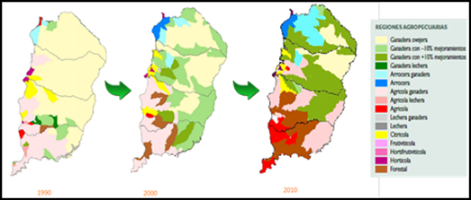 La producción ganadera tiene una larga tradición en el país, particularmente esta región ha sido históricamente representativa de la ganadería extensiva. Sin embargo, en las últimas décadas la región ha sufrido cambios(24) (Figura 2) que han tenido consecuencias económicas, productivas y sociales.