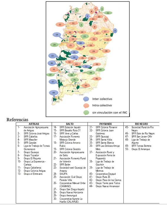 Respecto a los tipos de colectivos, en Salto hay una predominancia de los intra-colectivos (13 de 28), mientras que en Río Negro solamente se registran 2 experiencias dentro de dicho tipo; distribuyéndose las restantes 7 en Artigas y 6 en Paysandú. Esta distribución se asocia a la territorialización de la actividad ganadera en la región y la distribución de los productores familiares. En el caso de los inter-colectivos, Paysandú cuenta con mayor presencia de este tipo (5 de 11), mientras que los restantes se distribuyen homogéneamente en los otros tres departamentos. Paysandú es el departamento más colonizado de la región litoral norte, con 28 colonias e inmuebles, que abarcan 107.212 ha, representando el 18 % de la tierra del inc a nivel nacional(31). Varias de estas colonias del departamento datan de los comienzos de la vigencia de la Ley 11.029, que posibilitó el desarrollo y consolidación de organizaciones de productores. La distribución homogénea en los demás departamentos se asocia a la intervención de la política pública en procura del desarrollo económico y social a nivel del territorio.