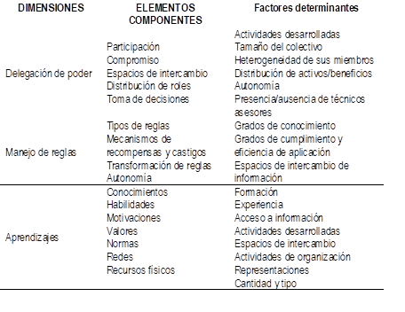 Este marco institucional favorece la existencia de normas sólidas y facilita la capacidad de hacerlas cumplir e incluso adaptar nuevas reglas, dado que dentro de la organización existen mecanismos que facilitan la comunicación y mejoran el flujo de información. En consecuencia, se fomentan actitudes cooperadoras, motivadas por una mayor confiabilidad entre los individuos, que los incitan a compartir saberes comunes y generar saberes colectivos de forma espontánea, contribuyendo al cumplimiento de las reglas y normas(15), por tanto, a la consolidación del funcionamiento de la experiencia colectiva.