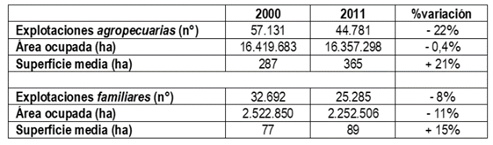 La estructura agraria de la zona se caracteriza por una presencia importante de productores familiares, que en anteriores estadísticas agropecuarias eran clasificados como «productores pequeños». De acuerdo con el reprocesamiento de los censos generales agropecuarios de 2000 y 2011(27), se puede observar una disminución en cuanto al número de explotaciones agropecuarias en general y familiares en particular, aunque esta última menos acentuada (Tabla 2). La disminución del número de explotaciones totales en el país es un proceso que viene ocurriendo desde la década del cincuenta a causa (entre otras) de la modernización de la producción agropecuaria, que llevó a la implementación de paquetes tecnológicos que redujeron fuertemente la competencia de la producción familiar en relación con la capitalista(28).