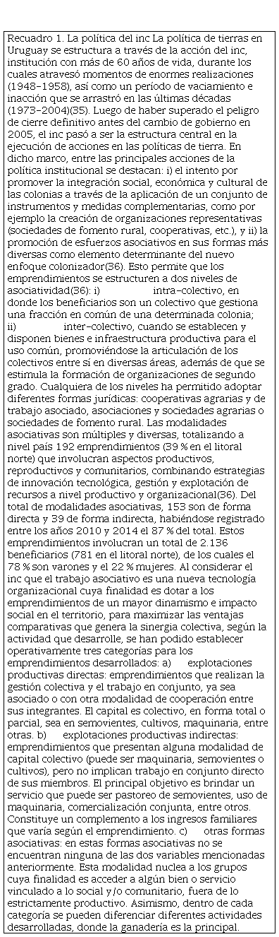 Abstract: The transformations that have occurred in recent years in Uruguay have challenged the State to find adequate tools for the application of policies and differentiated support to family farmers. One strategy has been the promotion of associative processes, promoted with ministerial programs from the General Directorate of Rural Development (dgdr), and from the National Institute of Colonization (inc), for collective access to land. In order to understand the collective action processes of family farmers in the north coast of the country, the experiences of collective access to inc lands in Artigas, Salto, Paysandú and Río Negro were identified and analyzed. The research included the review of secondary sources and a field survey through interviews with qualified informants and referents of each of the experiences. 38 experiences with access to land were identified through two levels of associativity: 27 cases in which the beneficiaries manage a fraction in common, which have been generated exogenously and are in the process of organizational consolidation; and 11 cases that have assets for common use, which have several years of experience, being first-degree organizations with shaped structures. Between both types, contrasting differences are observed in the ways of coordination and construction of collective action, due to common needs and interests to obtain individual and collective benefits.