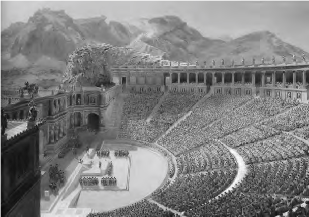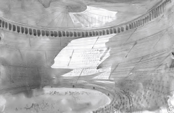 Un momento folgorante in questo processo è dato dal disegno che propone la ricostruzione del teatro di Taormina (Figura 1), potente ricreazione intuitiva più che analitica del monumento, lungamente descritto da Viollet anche nelle sue lettere sulla Sicilia (Viollet-le-Duc, 1860: 134-138). La visione si integra con il paesaggio tra l’Etna e il mare e restituisce un’antichità vibrante, priva di scrupoli didattici. Allo stesso modo, la percezione del Colosseo si nutre del fascino del rudere in una vista notturna: ma anche nella sintetica veduta (Figura 2) che lo rievoca pieno di spettatori e con il velario dispiegato (Pariset, 2014: 26).