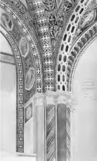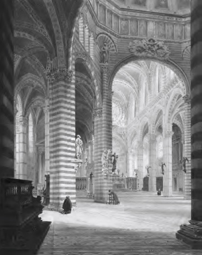 A confronto con la ricezione della classicità, lo sguardo rivolto agli edifici del medioevo si sofferma su aspetti decorativi più che strutturali e si appoggia ancora a categorie storiografiche malferme –ad esempio nella dilatazione del significato di byzantin– tuttavia condivise con la cultura dell’epoca. Viollet percepisce con attenzione la policromia del S. Francesco di Assisi (Figura 3) o del Duomo di Siena (Figura 4), così come l’uso dei materiali nel S. Lorenzo a Genova, le variazioni chiaroscurali nel chiostro di S. Giovanni in Laterano a Roma, i rivestimenti marmorei di S. Maria del Fiore a Firenze, o infine la ricchezza del soffitto della cattedrale di Messina, ispirato a modelli arabi. Ma l’impressione suscitata dai monumenti italiani è profonda: la facciata del palazzo Ducale a Venezia, nell’inversione dei tradizionali rapporti tra pieni e vuoti, viene reinterpretata a distanza di decenni negli Entretiens come «s’il était élevé en bois», confermando così la predilezione per una concezione architettonica basata sull’equilibrio delle spinte, più che sulla statica gravità.