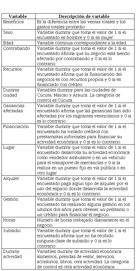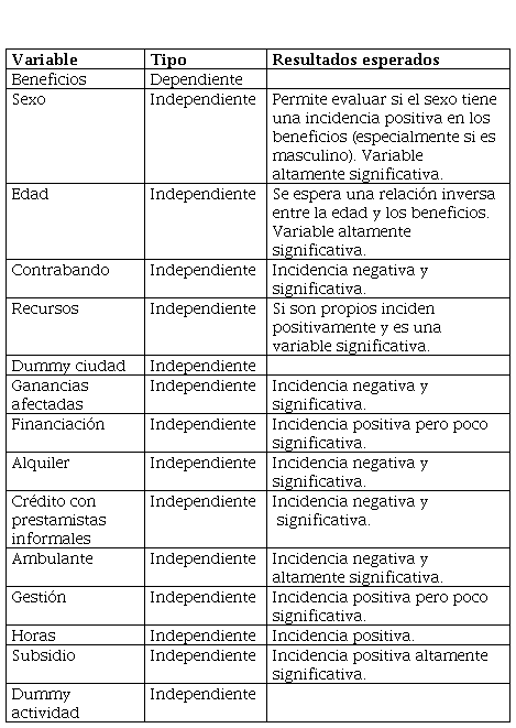 La encuesta permitió de esta manera determinar las variables que constituyeron el objeto de este estudio: las características y condiciones de los créditos informales, la incidencia de la migración, de la tasa de cambio y del contrabando en los beneficios de los comerciantes informales.